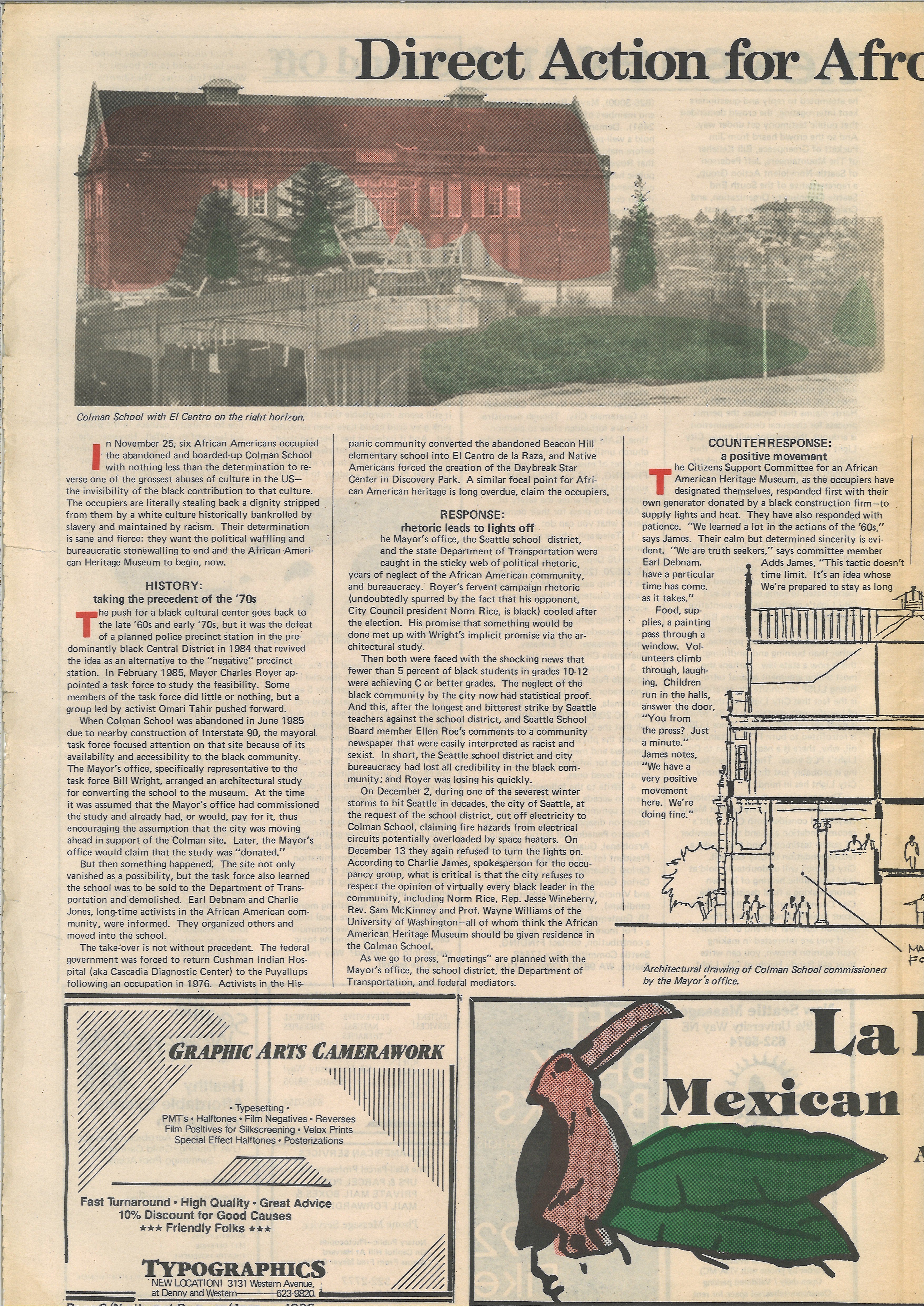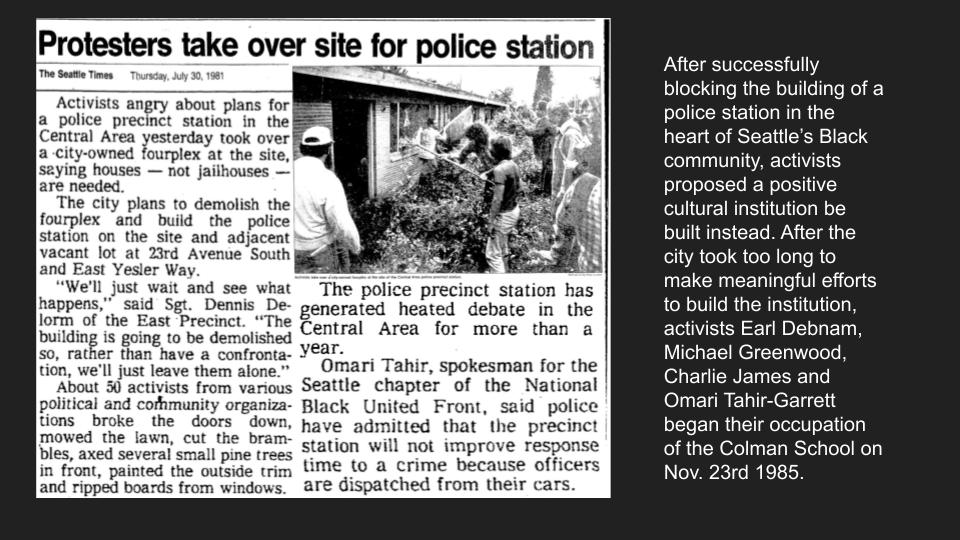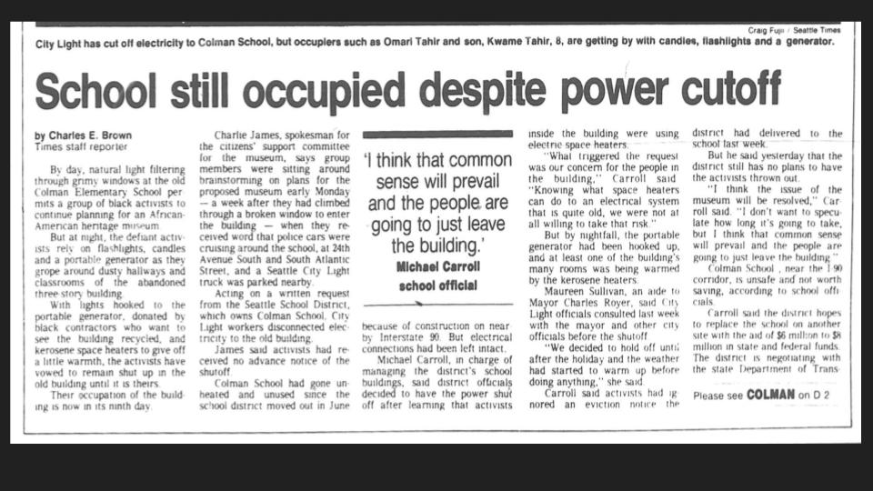 -On June 4th, 1998, the Paul Schell mayoral administration used the temporary confusion created by Mr. Flowers as an opportunity to breach the City’s agreements with the AAHM&CC, and sent a violent SWAT Team to illegally eject the AAHM&CC from the Colman School as well as from two portable buildings in its parking lot. In spite of this rogue violence by the City, the AAHM&CC continued to raise funds to fulfill its Purchase & Sell Agreement on the building.
