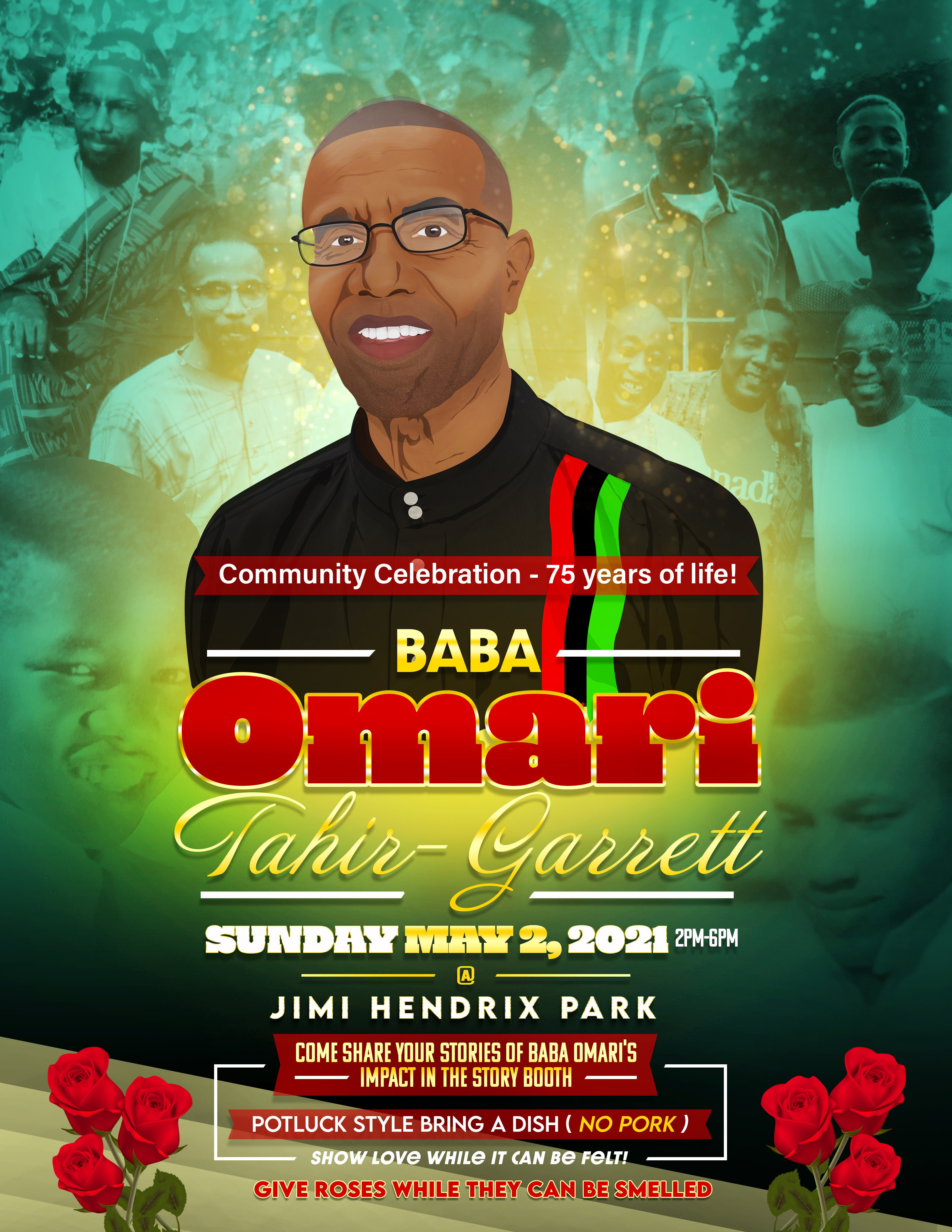 Baba Omari posing next to the Umojafest Peace Center sign.
