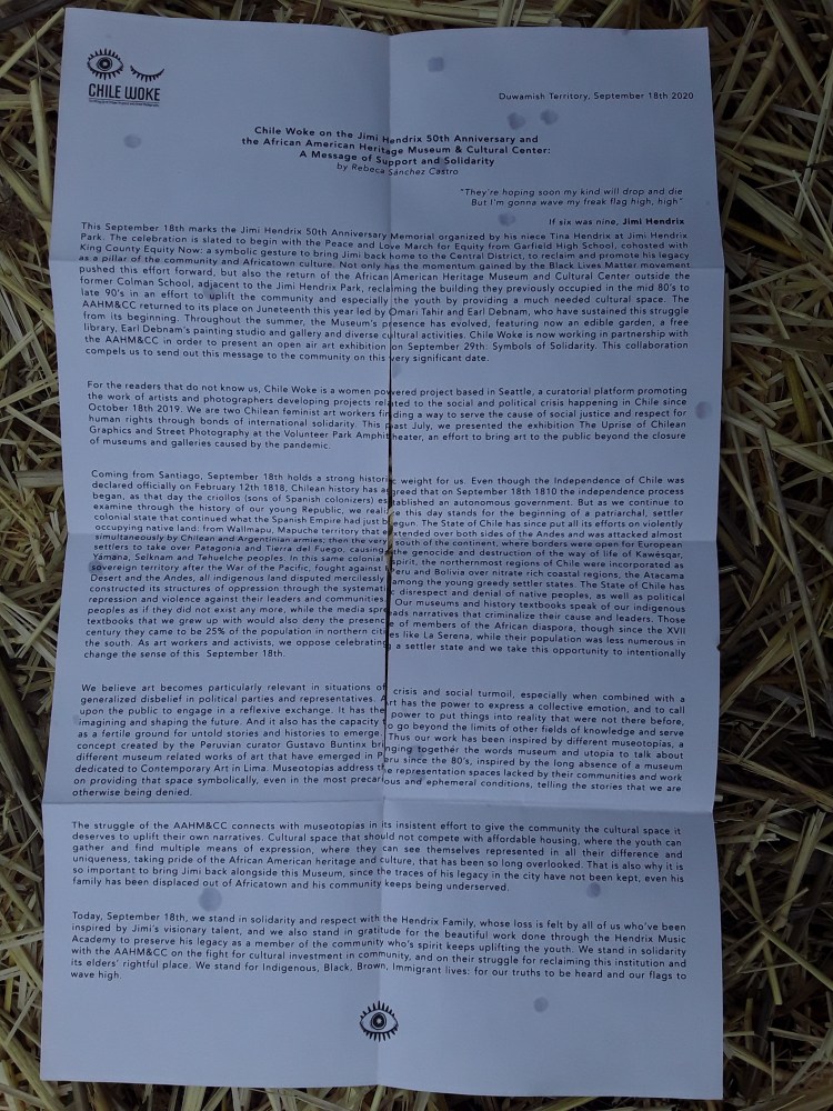 The Chilean arts collective Chile Woke issued this moving statement on the connections between the Jimi Hendrix 50th Anniversary celebration in Jimi Hendrix Park, the return of the African American Heritage Museum & Cultural Center to it’s own rightful building adjacent to that Park, and the peoples’ democratic uprising that has been taking place in Chile since October 18, 2019.