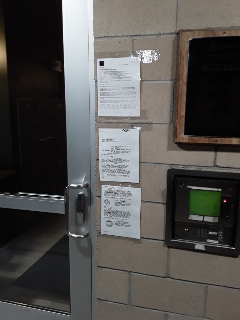 The object is a laminated letter from “URBAN LEAGUE OF METROPOLITAN SEATTLE” Board Member John F. Williams Esquire, signed by him in the name of “URBAN LEAGUE VILLAGE LLC”, printed on the letterhead of his high corporate DNC lawfirm Perkins Coie, dated March 10th and demanding that we abandon our own property by March 14th–10 days before the ugly object was sticky-taped upon us. (The ugly object also alleges itself to have been mailed to somebody, but it’s unclear to whom.)