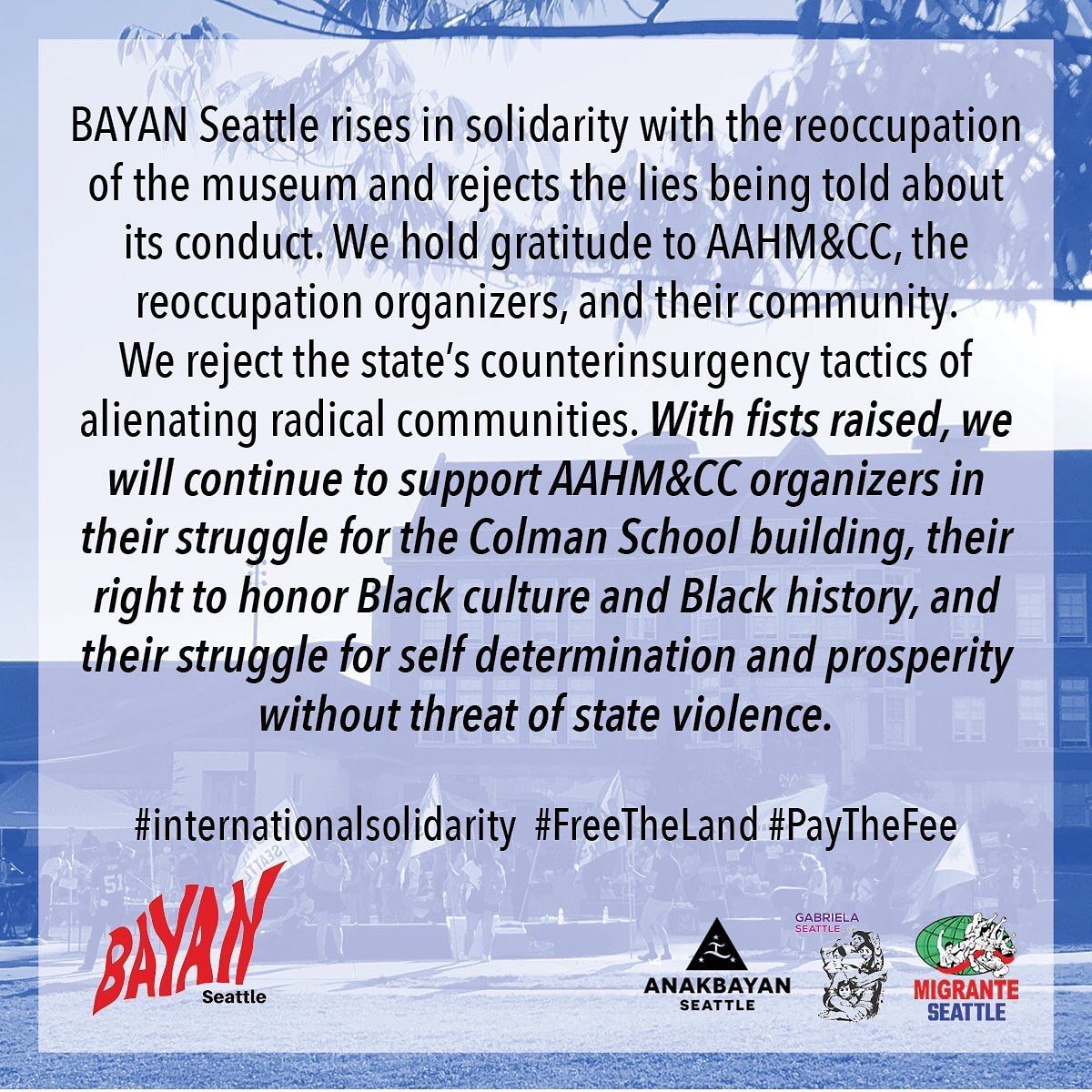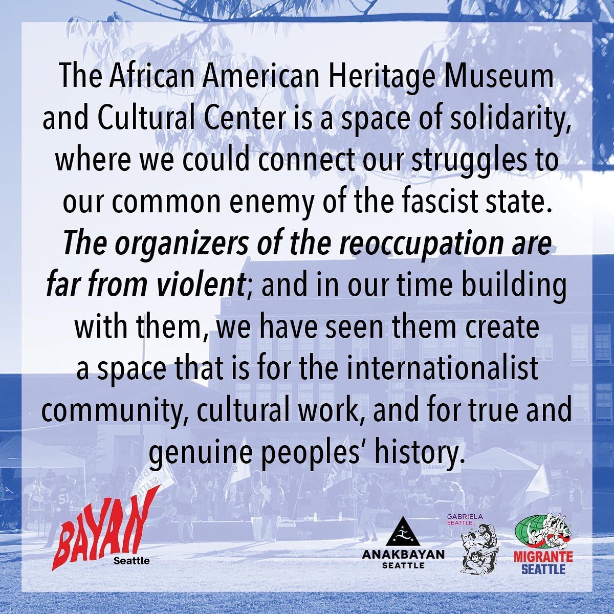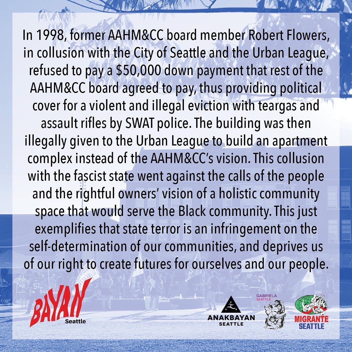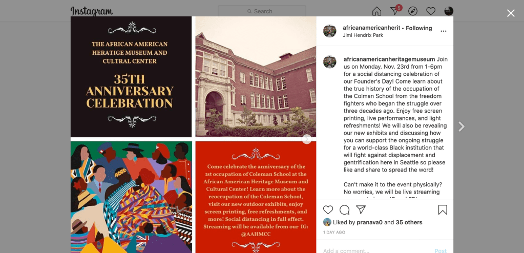 2021-02-11 The AAHM&CC asks all readers to pause for a moment of silence here to uplift and acknowledge the two victims shot, one of them fatally, late Tuesday night in the Urban League occupied/controlled parking lot of our Museum by the employee of “Coast Property Management” (hired by the Urban League and approved by the City of Seattle), as well that employee himself–who was then shot and killed by the SPD later the same night. We send strength, power and love to the families and all affected by this tragedy.