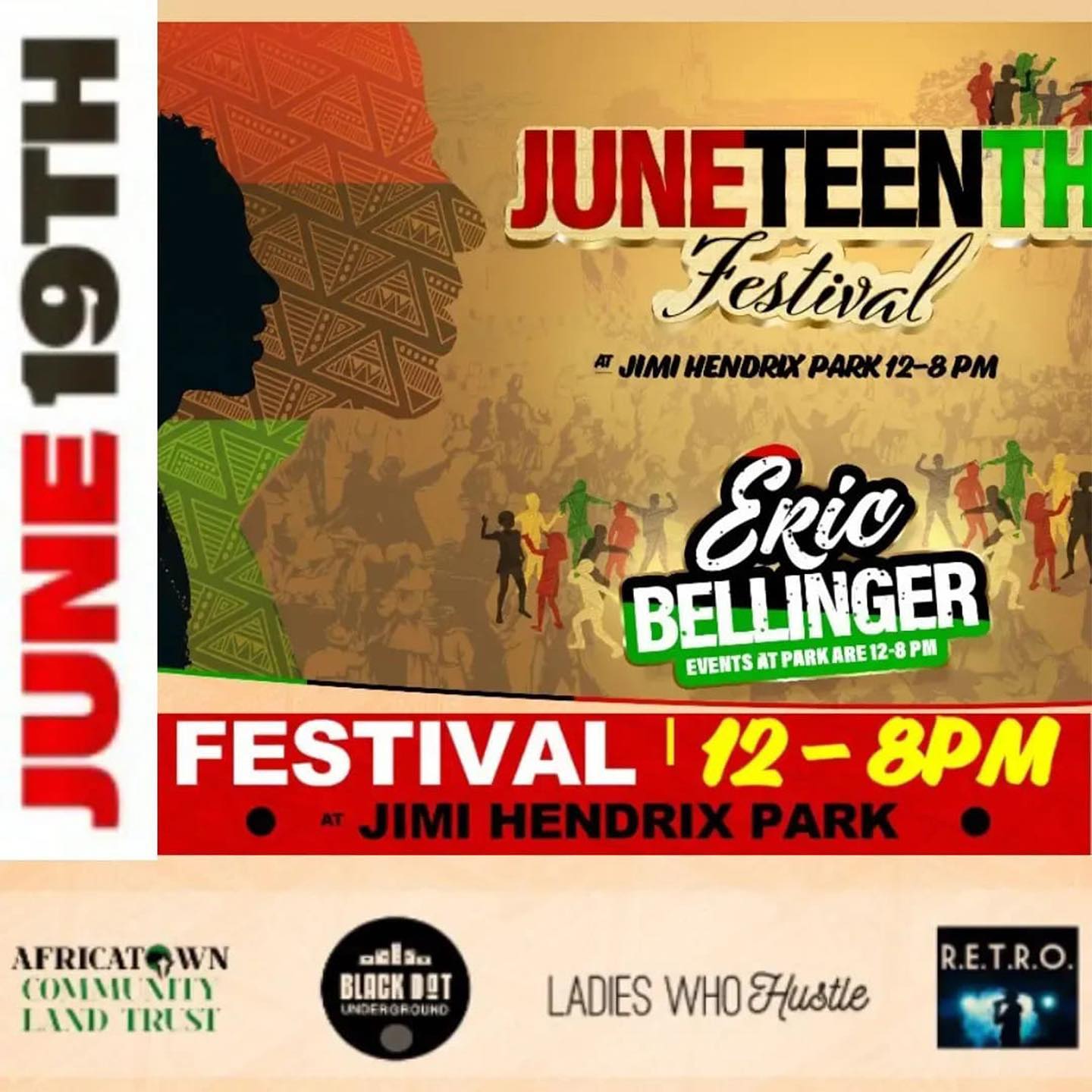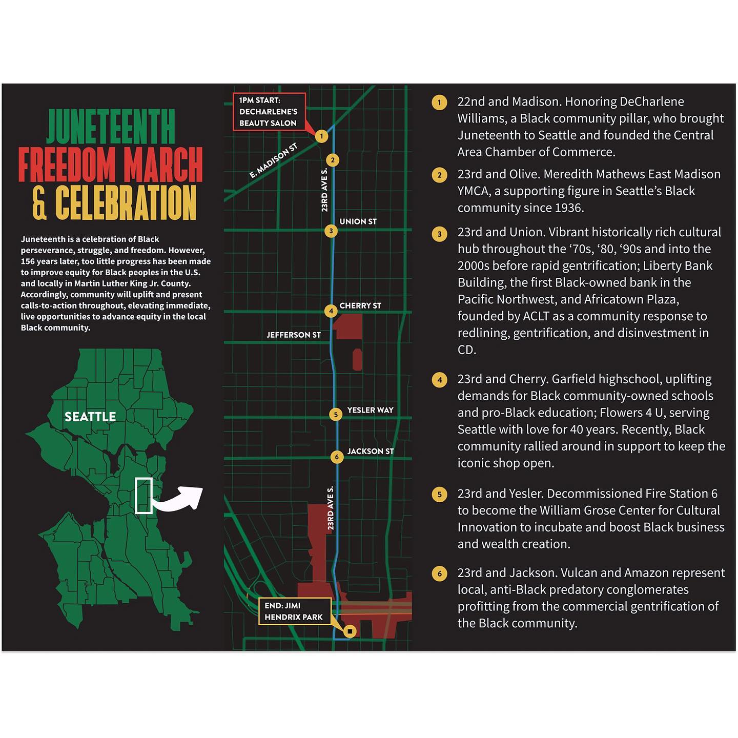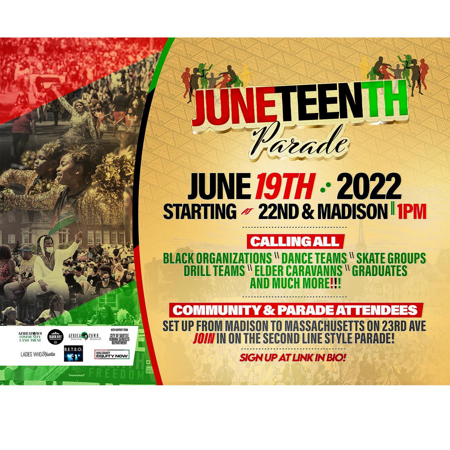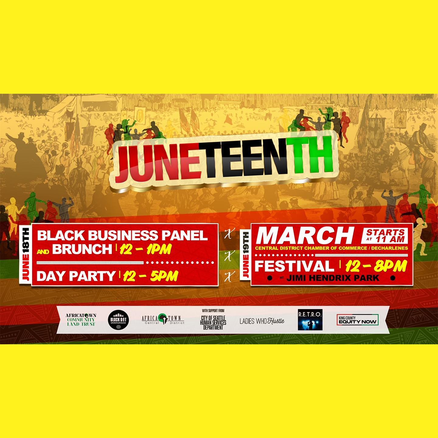 2022-06-18 through 06-19 For THIRD YEAR IN A ROW, the Central Area JUNETEENTH MARCH through HISTORIC AFRICATOWN will proudly arrive at our Peoples’ powerful celebration in Jimi Hendrix Park!